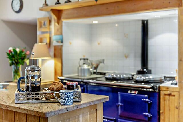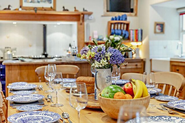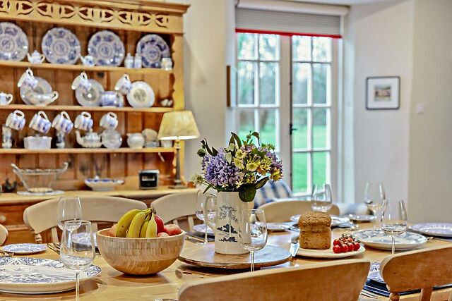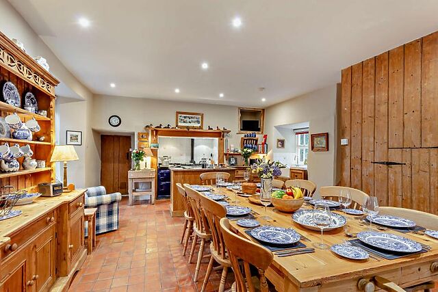 This room opens directly to the welcoming dining space, with an Aga at the far end, antique pine dressers filled with blue-and-white crockery, and a large dining table for gathering around to enjoy hearty meals. This leads through to the separate kitchen which includes a more conventional electric oven and hob, as well as a microwave, dishwasher, washing machine and tumble dryer.