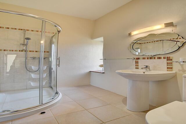 The living area includes a plump sofa, underfloor heating, and a well-equipped kitchen. A spiral staircase leads to the mezzanine bedroom, complete with a double bed and en-suite bathroom.