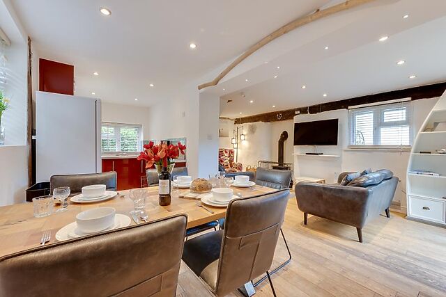 The cottage boasts a cosy living room with two large sofas, a wood burner, and a TV, ensuring a comfortable stay. The dining area is conveniently positioned between the living room and the well-equipped kitchen, which includes modern appliances for an easy self-catering holiday.
