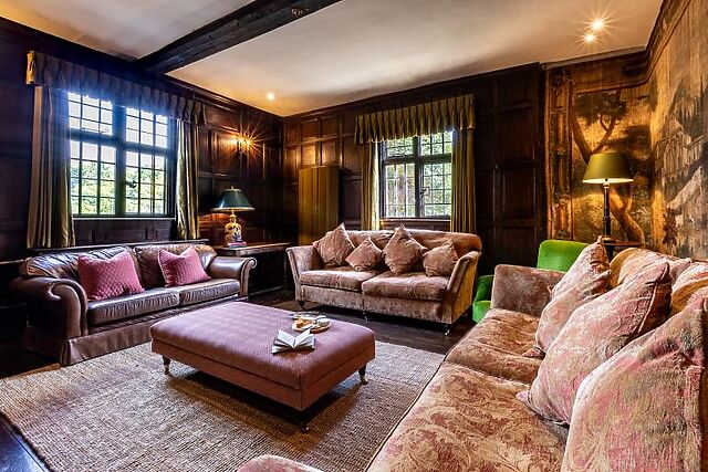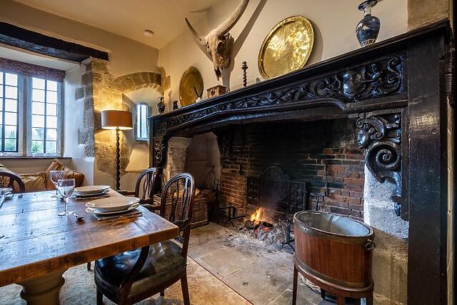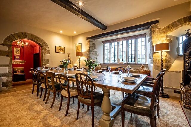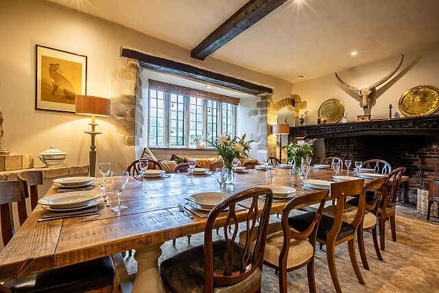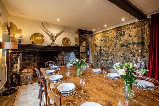 Step through the ancient oak door into the medieval hall with its grand open fireplace and flagged floor. The Tudor dining room, with its original fireplace and oak panelling, offers a splendid setting for memorable meals.