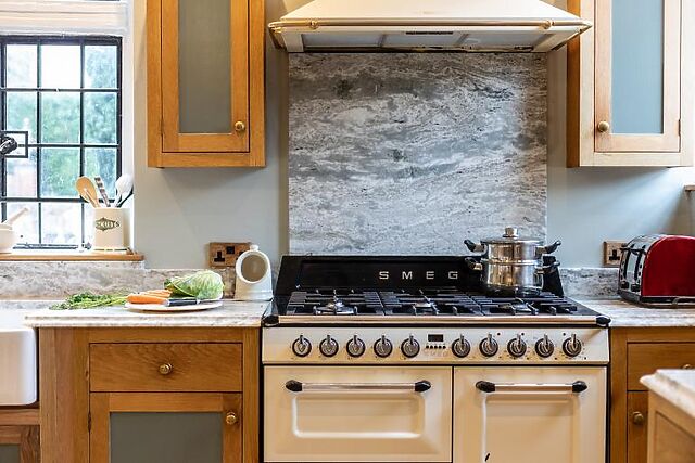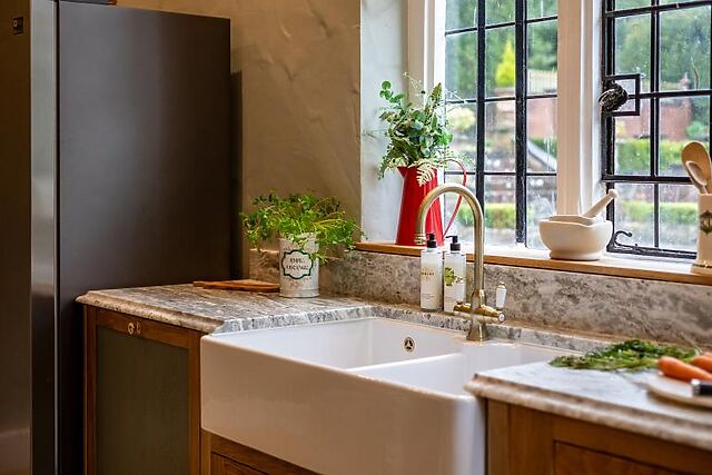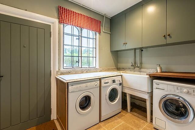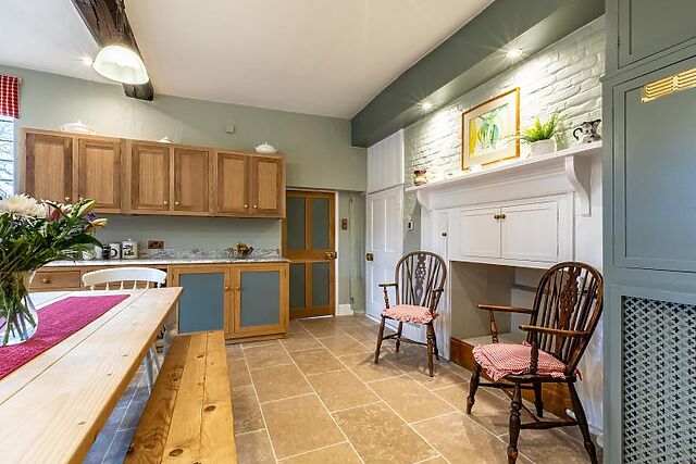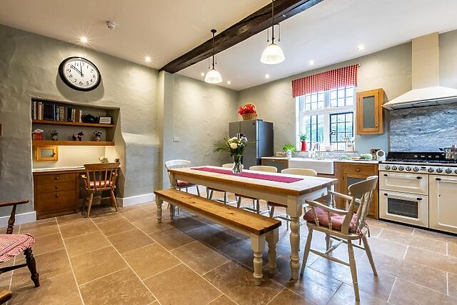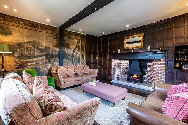 Step through the ancient oak door into the medieval hall with its grand open fireplace and flagged floor. The Tudor dining room, with its original fireplace and oak panelling, offers a splendid setting for memorable meals. The large, well-equipped kitchen ensures you have everything needed to prepare a feast, including an electric range style oven, microwave, and dishwasher.