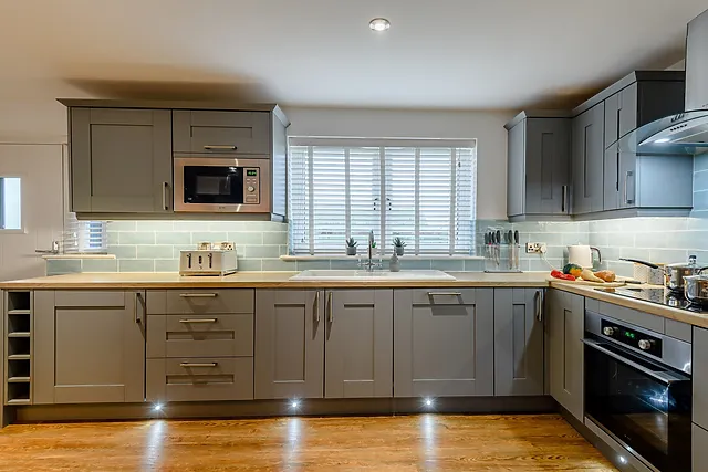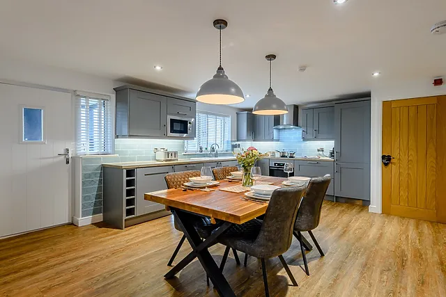 The cottage is well-equipped with modern amenities including an electric oven, induction hob, dishwasher, fridge/freezer, and a microwave, ensuring all your home cooking needs are met.