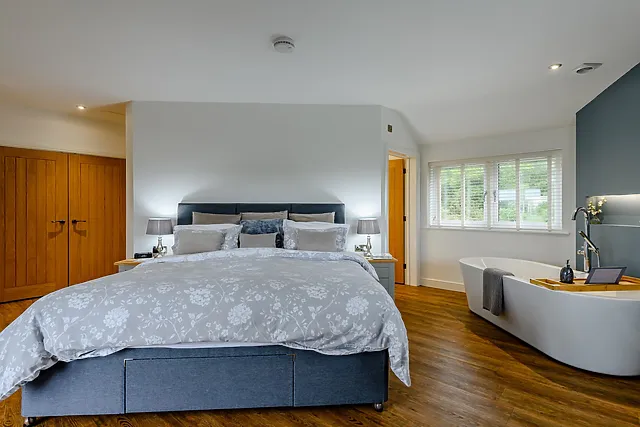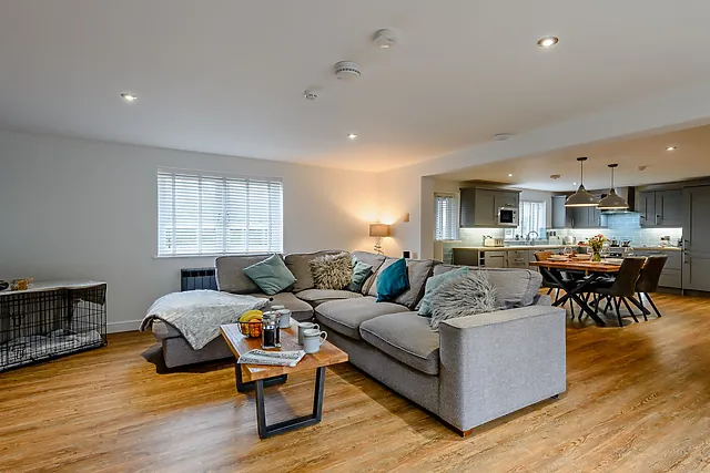 Inside, the open plan lounge/kitchen/diner features a wood burner, creating a cosy atmosphere for those cooler evenings. Bi-fold doors open onto a private garden, where you can enjoy al fresco dining or simply relax in the hot tub under the stars.