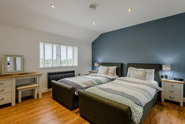 The cottage boasts two beautifully appointed bedrooms, one with a super-king-size bed and the other with twin beds, both designed to ensure a restful night's sleep.