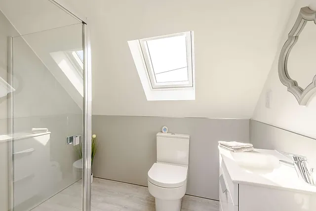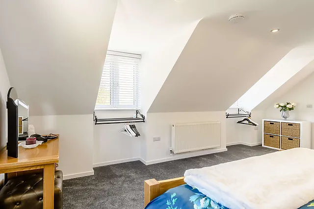 The king-size bedroom with a vaulted ceiling adds a touch of grandeur, while the en-suite shower room ensures privacy and convenience.
