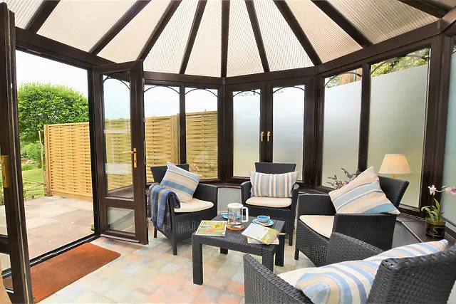 The conservatory provides a peaceful spot to enjoy the picturesque views.