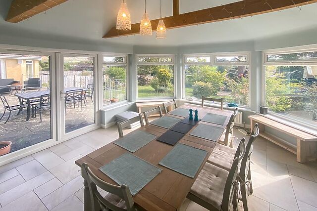 Sit at the dining table in the garden room-cum-dining room, which overlooks the fantastic outdoor space. Just beyond the kitchen is a utility room with laundry facilities and a WC.