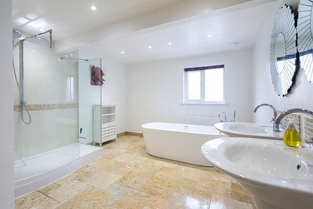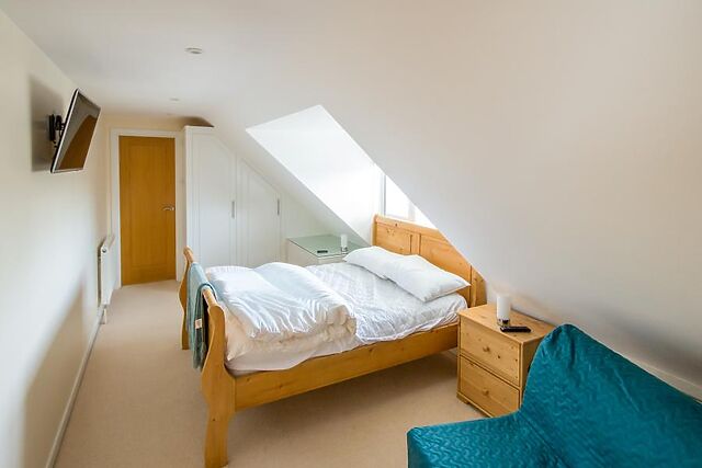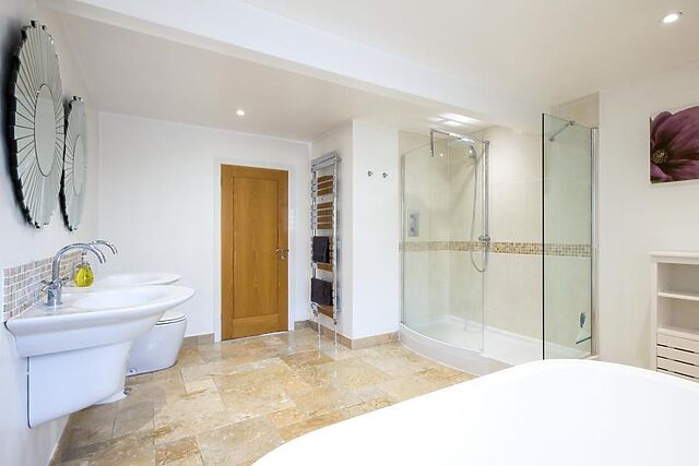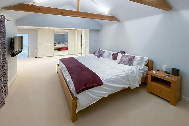 The first of the bedrooms is on the ground floor too, an emperor-size bedroom with an en-suite containing a sumptuous roll-top bath, a separate shower, and a WC. This bedroom has doors which open out onto the little patio area.