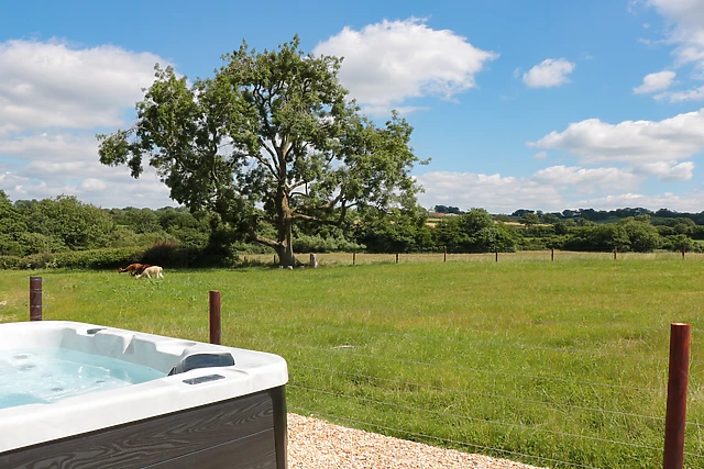 Yes, the property features a private hot tub, offering guests the perfect opportunity to relax and enjoy the scenic countryside views.