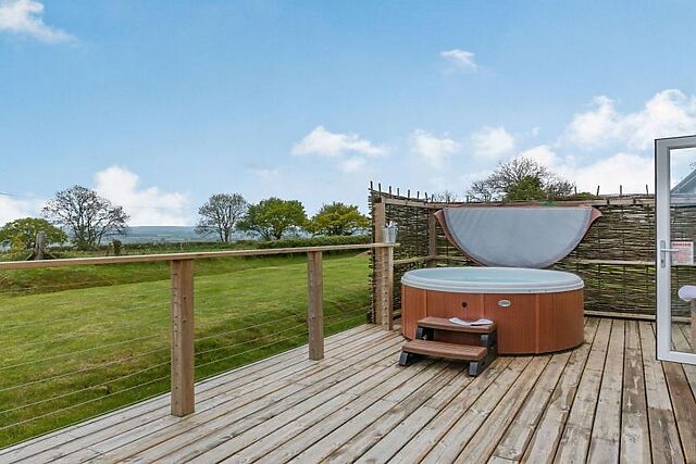Yes, the property features a private hot tub located on the open terrace, providing guests with a luxurious spot to relax and enjoy the stunning countryside views.