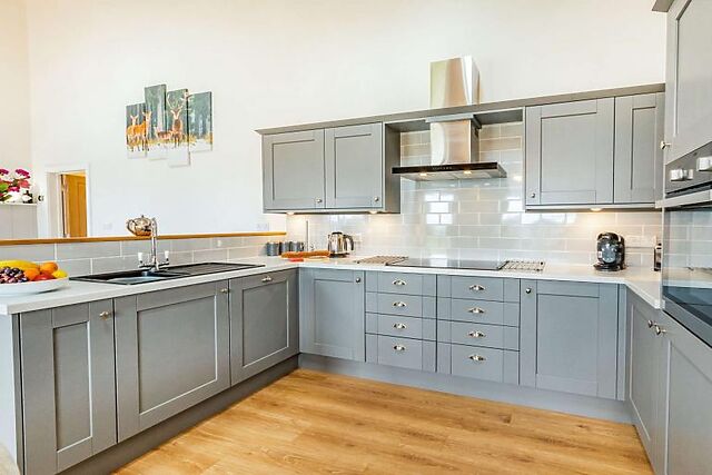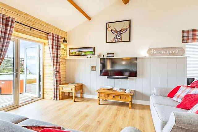 The accommodation boasts a contemporary open-plan living space with a vaulted ceiling, a fully integrated kitchen, and a cosy lounge with a Smart TV.