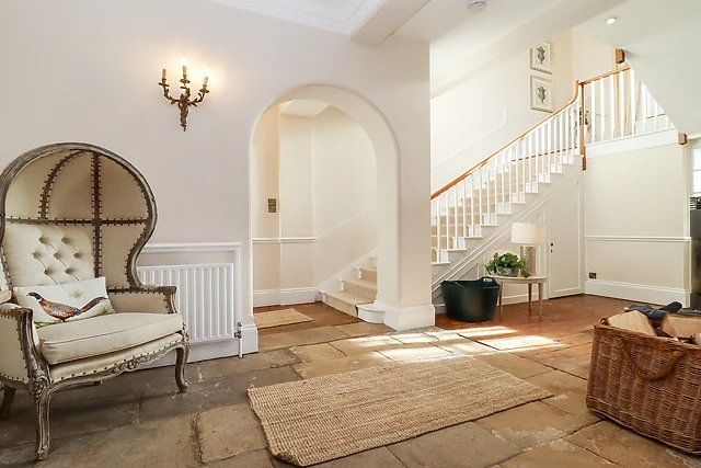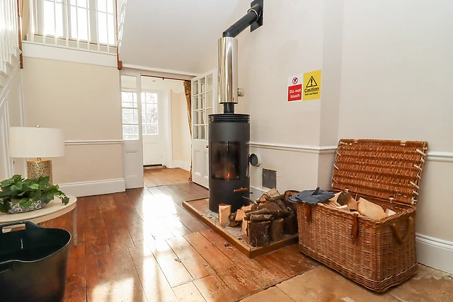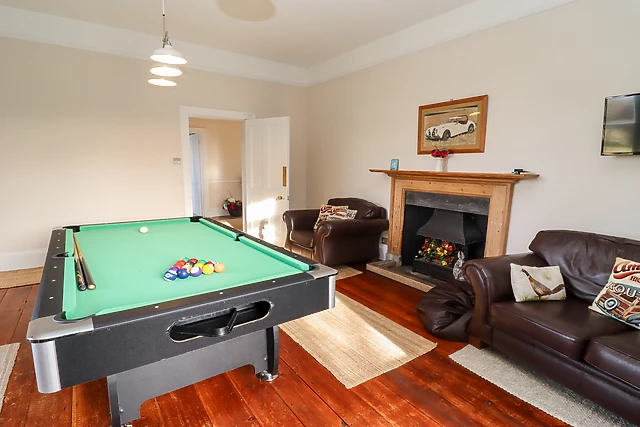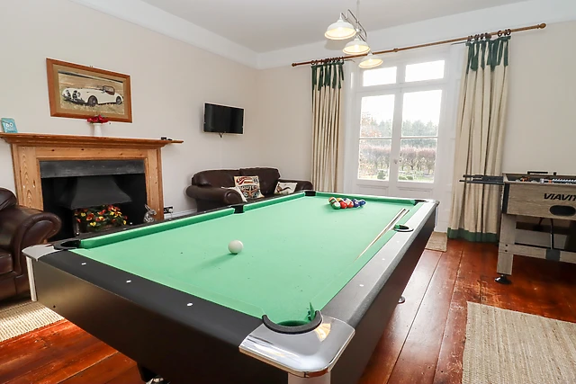 Inside, the property boasts a cosy woodburning stove, a games room equipped with snooker table and table football, and a conservatory and orangery for serene garden views.
