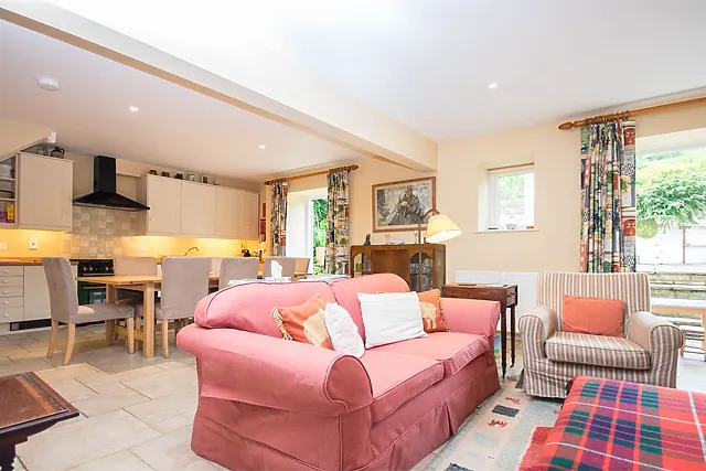 The open-plan lounge/kitchen/dining area has plenty of space for the entire family and combines contemporary and traditional features, creating a relaxed and welcome feel. When the temperature drops you can fire up the wood burner and curl up on the sofa to watch a movie on the Smart TV.