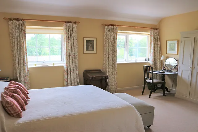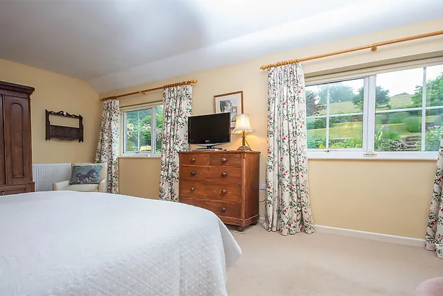 The four bedrooms are spacious and have views across the garden or village. French doors from the lounge area lead out onto a patio and tiered garden.