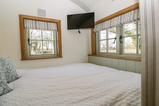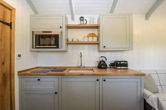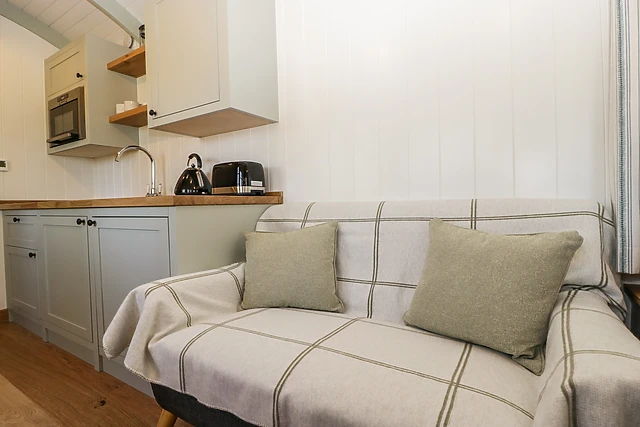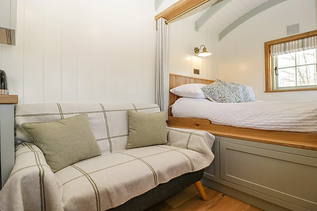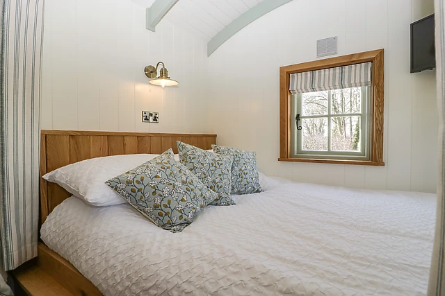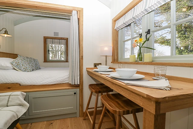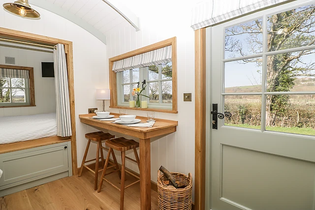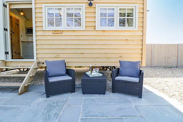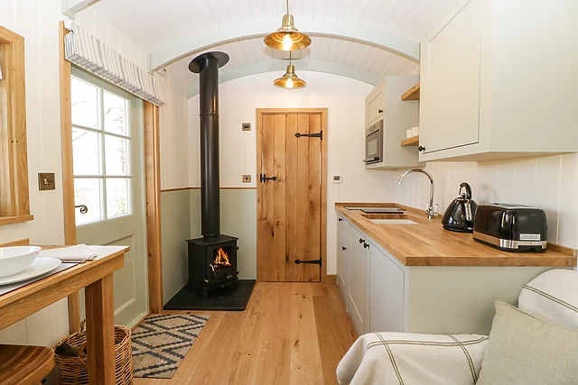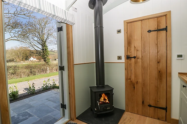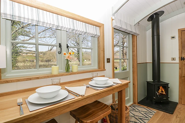 Acorn offers a cosy studio-style layout with a double bed, kitchen, and dining area, complete with a warming woodburning stove.