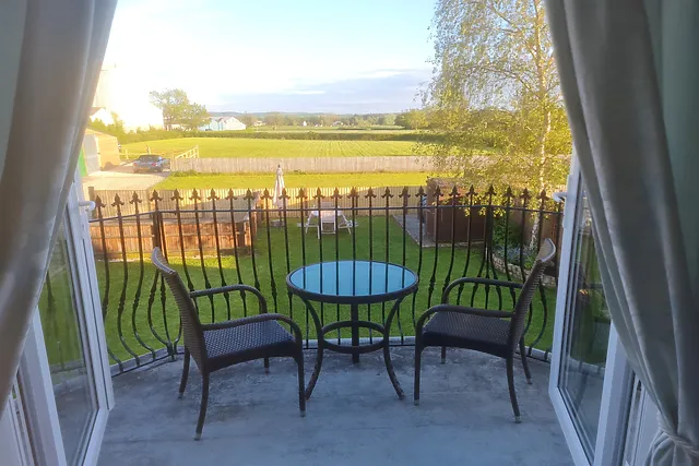 The master suite opens to a private balcony with sweeping countryside views, enhancing the cottage's charm.