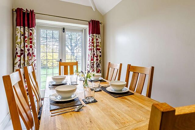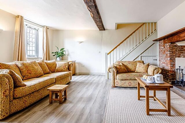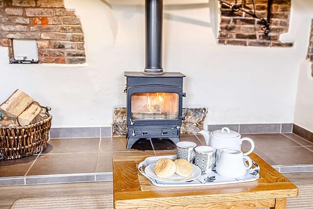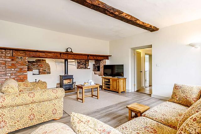 Back to the hall and into the cosy lounge, which features exposed beams, slate flooring and a large inglenook fireplace housing a woodburner. Here you will also find a Smart TV with Sky TV, Netflix, Amazon and Disney+ to keep the whole family entertained.