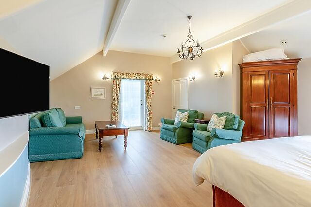 Inside a traditionally warm welcome awaits as the light and airy entrance hall leads into a lounge with a choice of sofas, a huge Smart TV, and the original hotel bar – perfect for functions or drinks with friends. Head in another direction from the hall and into the dining room which can comfortably seat 17; the updated kitchen has all the appliances you’ll need to cater for a large party and there is plenty of storage space in the larder, but for total time off you can pre-book professional catering directly with the owners.