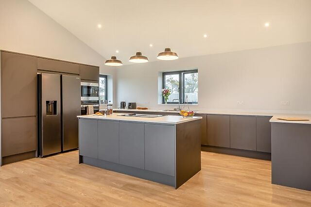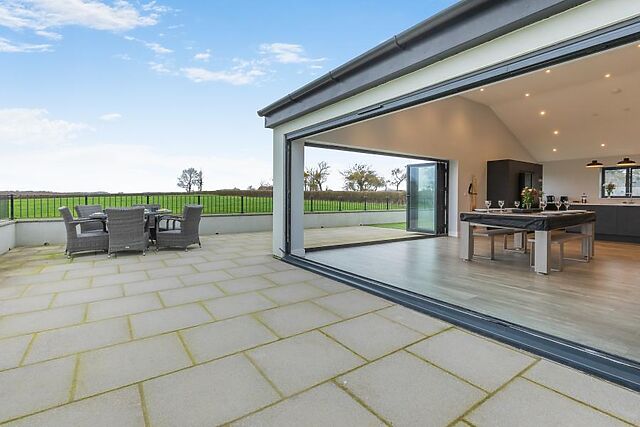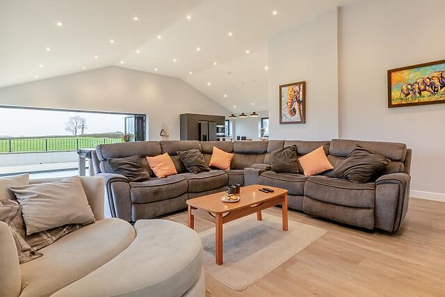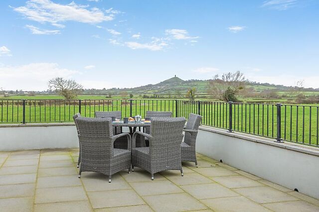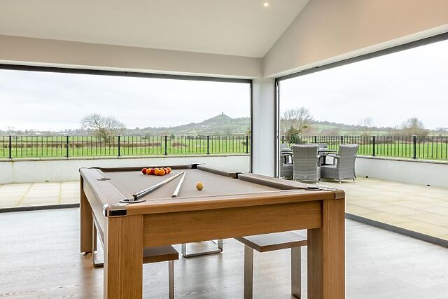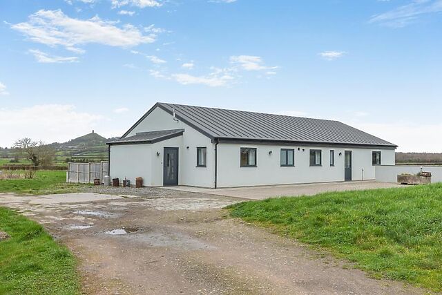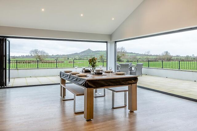 Enter through the front door into a generous entrance hall that provides easy access to every room. From here, the heart of the retreat opens up into a striking open-plan lounge, kitchen and dining area, where soaring ceilings and expansive bi-fold doors frame far-reaching views that stretch all the way to Glastonbury Tor.