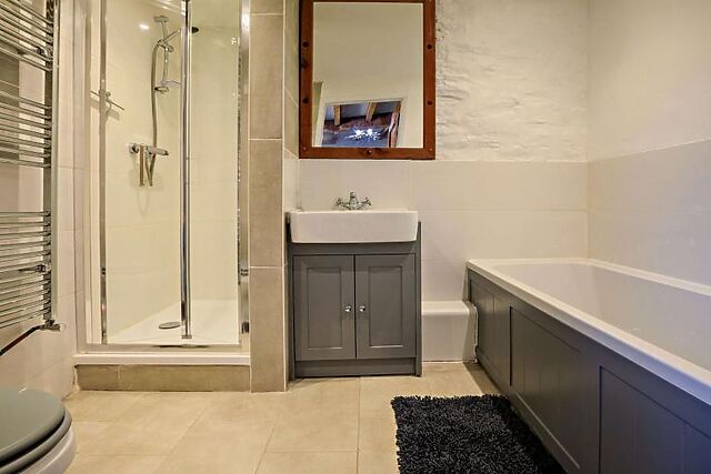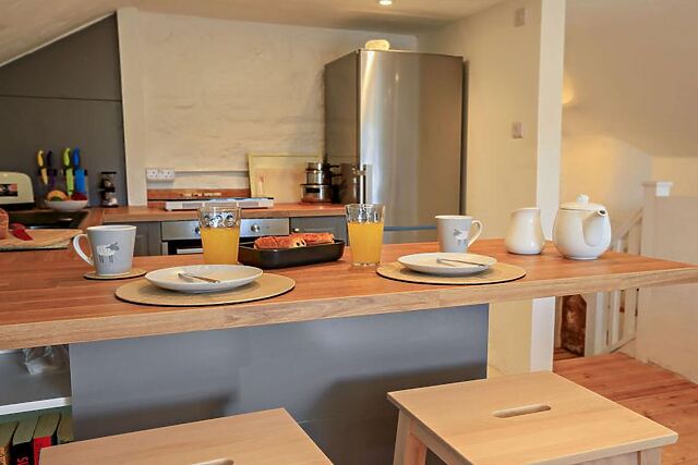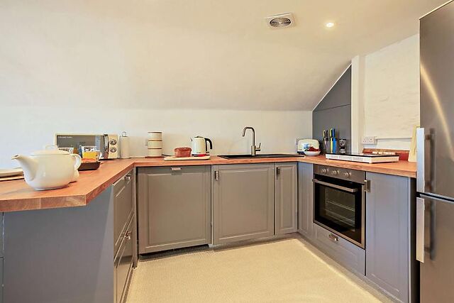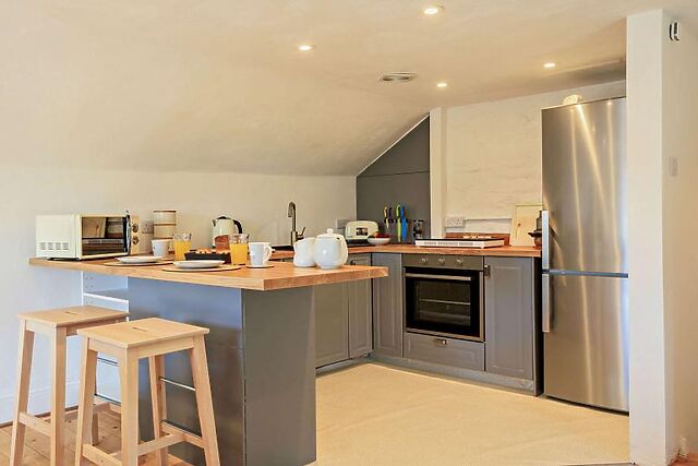 The cottage is equipped with a perfectly appointed kitchen, including an electric oven and two-ring hob, fridge/freezer, dishwasher, and microwave. It's an excellent space for preparing meals.