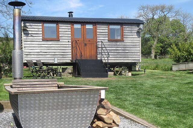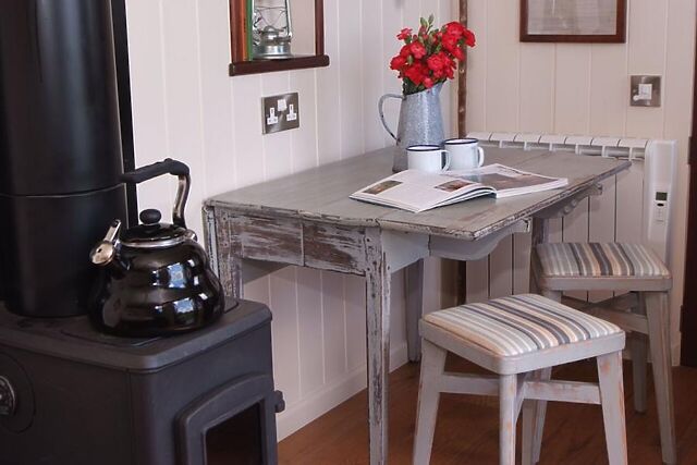 Among its many wonderful touches are mood lighting and a small wood burner. Cook delicious meals in the fitted kitchen area, which includes a ceramic hob, small fridge, compact microwave and ceramic sink with hot and cold running water.