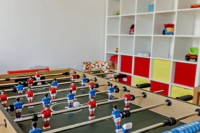 Family-friendly facilities are abundant, including a children’s playroom filled with toys, an outdoor play area, and a games room, making it an ideal location for guests with children.