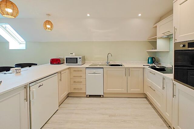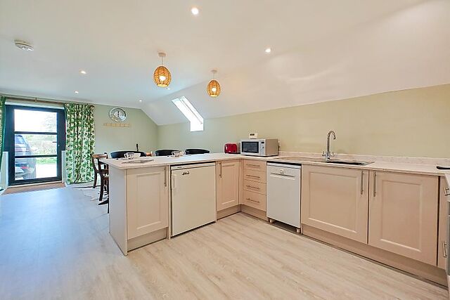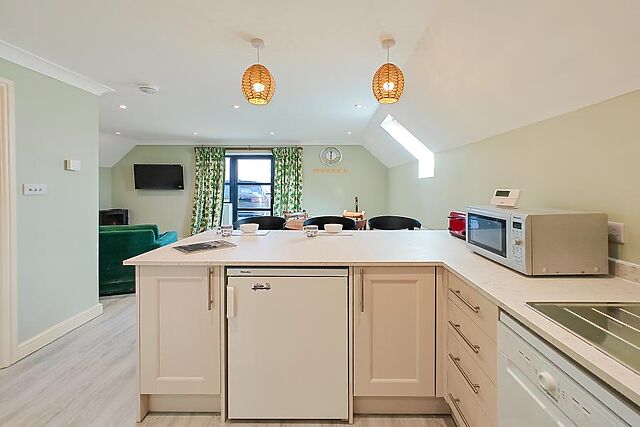 With an L-shaped layout, the lounge is tucked into one corner, complete with a loveseat, a Smart TV, and a wood burner-effect electric fire – perfect for cosy movie nights. The whitewashed kitchen boasts everything you need for cooking up holiday feasts, which can be enjoyed at the breakfast bar or around the traditional wooden dining table.