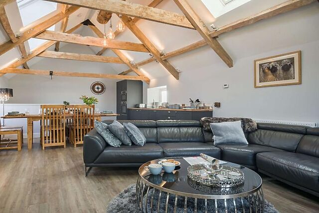 Step inside to find an open-plan living area with a lounge, kitchen, and dining space.