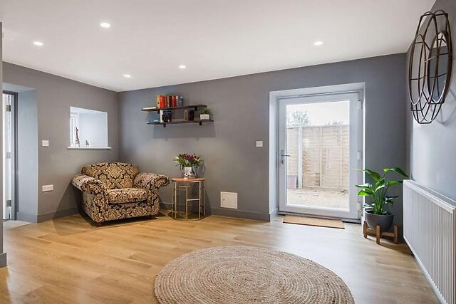 The property boasts a large, enclosed garden with a patio and lawn, ideal for al fresco dining or simply soaking up the serene atmosphere.