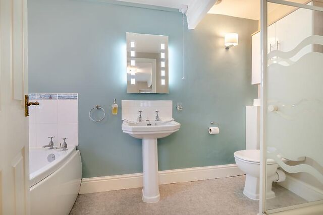 Three ground-floor double bedrooms are accessed from the entrance hall – one has an en-suite bathroom with a separate bath and shower – along with a family shower room. There is also a handy WC off the hallway.