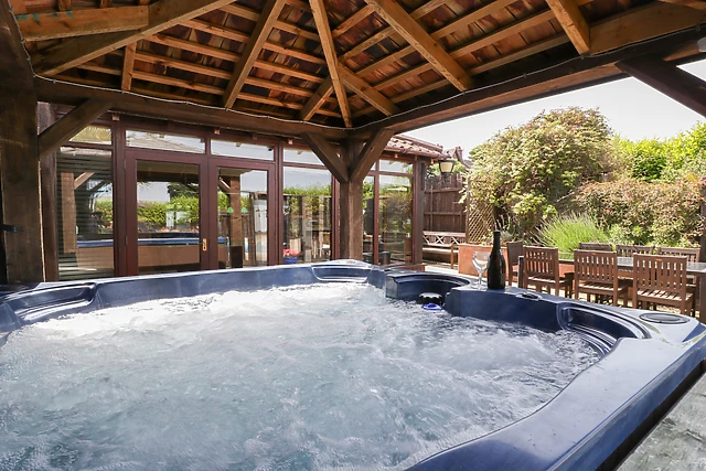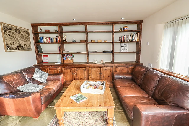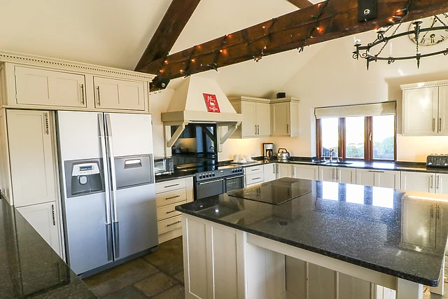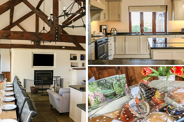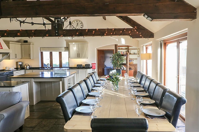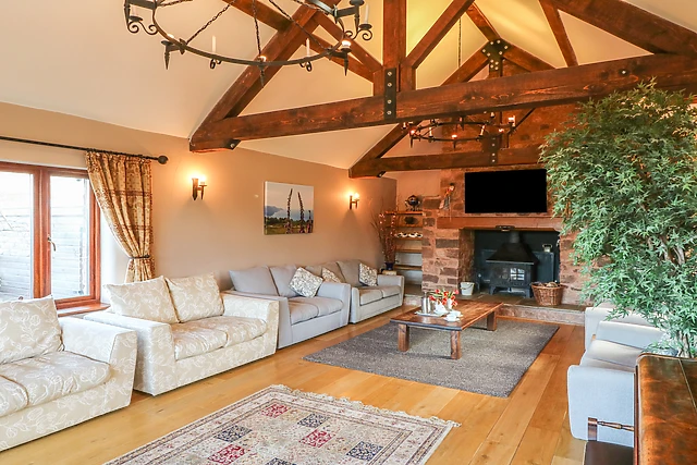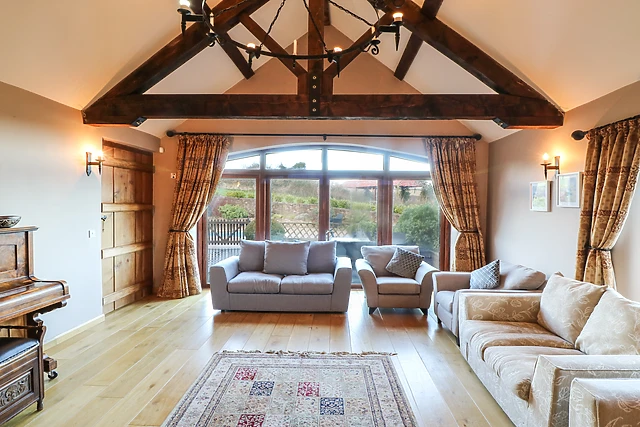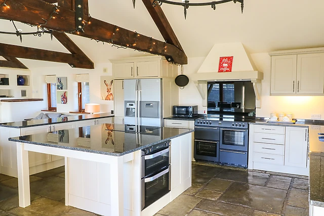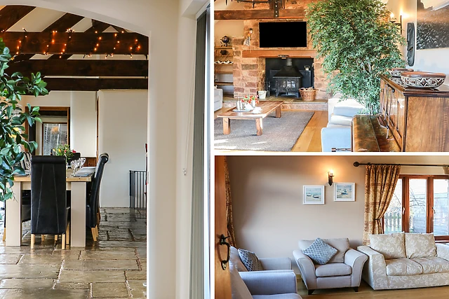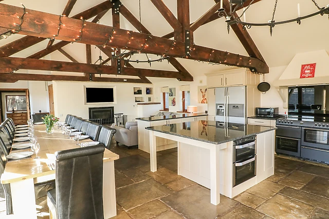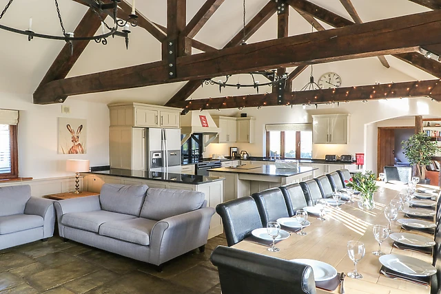 On cooler evenings, retreat back into this hub where a woodburning stove and sofas provide a snug spot for relaxing in front of the chef as they whip up some delicious food for all. The delightful sitting room has a high vaulted ceiling with plenty of exposed oak beams, with a collection of deep sofas and a woodburning stove resting beneath them, creating the best place to toast your toes after a day of walking in the countryside.