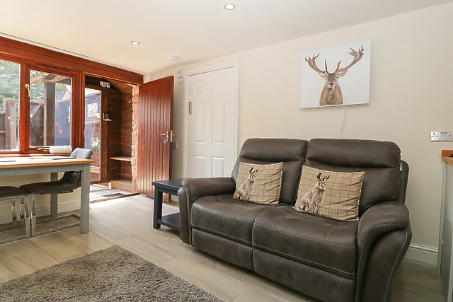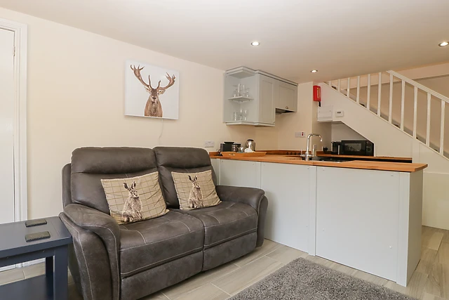 The open-plan living space is elegantly appointed with a modern kitchen, cosy dining area, and a relaxing seating area complete with an electric fire.