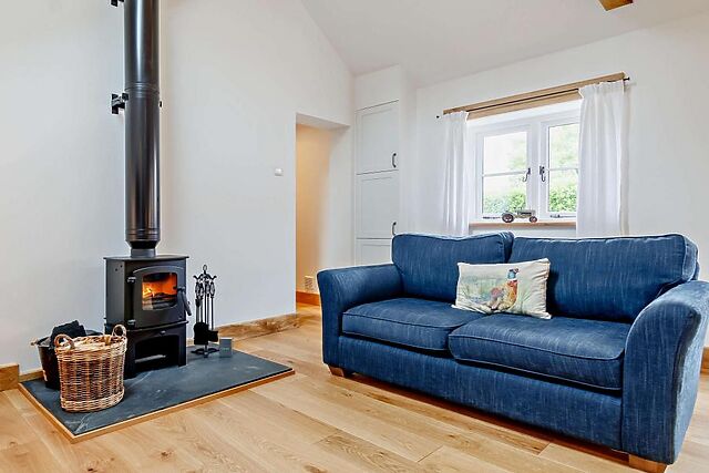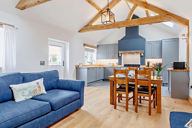 The open-plan living space, complete with a wood burner, is ideal for cosy evenings in. The modern kitchen is fully equipped for culinary adventures.