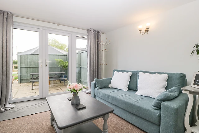 The property features a rear enclosed patio with outdoor furniture, offering a serene spot to enjoy a meal or a glass of wine amidst the countryside setting.