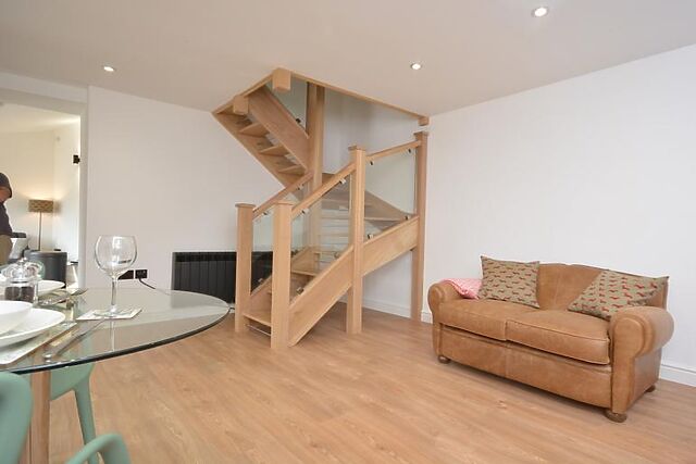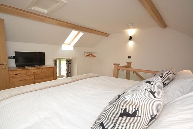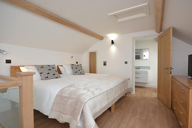 Stairs lead to the first-floor accommodation where the super-king-size bedroom can be found (can be made up as a twin on request). This restful room also benefits from its own TV/DVD player and a stylish en-suite shower room with a shower and WC.