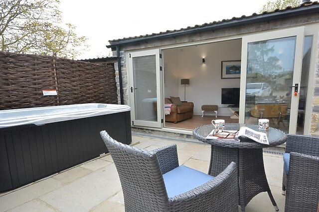 Outside, there is a private patio area to the front of the property where guests will find a table and chairs, as well the hot tub, which is particularly inviting at night, when guests can enjoy the warm bubbling water under the star-filled skies. There is parking for 1 car in front of the property.
