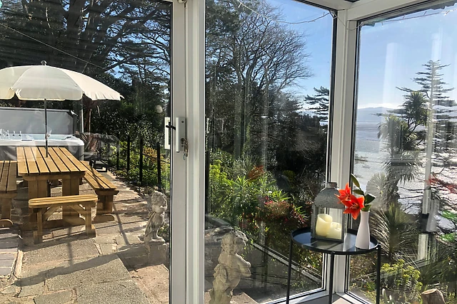 Yes, the property features a well-maintained hot tub on the terrace, offering guests the luxury of relaxing with a view of the Menai Strait.