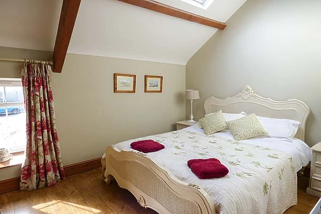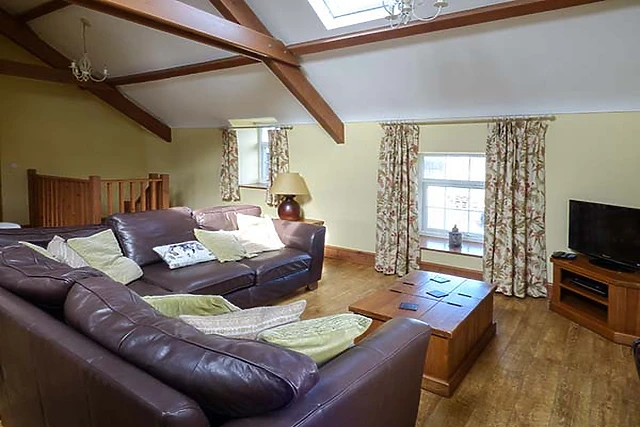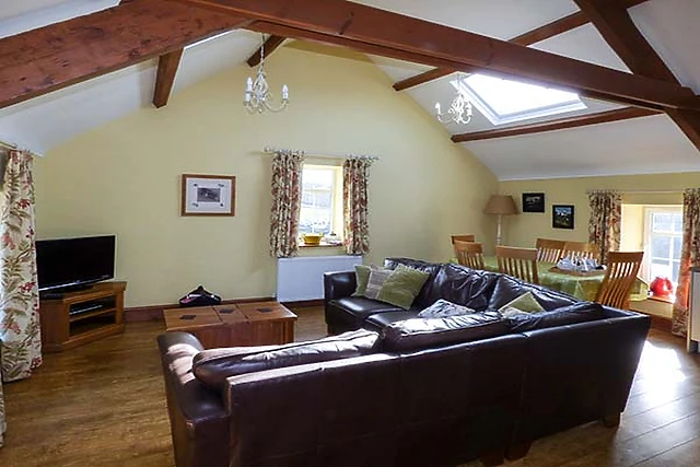 This charming detached, stone-built barn conversion is set next to the farmyard, providing an ideal base for families. With high ceilings and exposed beams, you enter this property via an enclosed garden area and then into a small hallway.