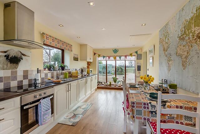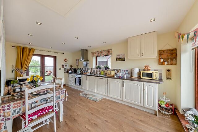 Double doors open from here onto the bright and airy kitchen/diner, which is decorated in a country cottage style and looks out over the garden. Rustle up delicious dinners for two in the kitchen area and sit down for romantic meals at the charming dining table.