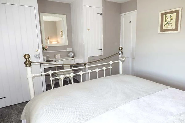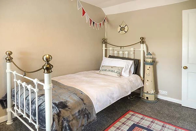The kitchen is modern and fully fitted with all you will need for an enjoyable holiday and a door leads out onto the attractive lawned garden. Upstairs are two beautifully styled bedrooms offering a cosy master bedroom with king-size bed, and coastal-themed twin room ideal for children or adults.