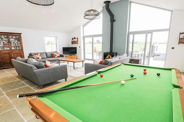 Begin your exploration in the impressive open-plan living space, with plenty of room for you to toast to a fantastic holiday around the dining table in the centre of the space before heading into the sitting area to absorb your countryside settings from the floor-to-ceiling windows. Take a seat in one of the sofas settled around the woodburning stove and discuss your plan of action for the rest of your fun-filled days ahead while the little ones make the most of the snooker table in the room.