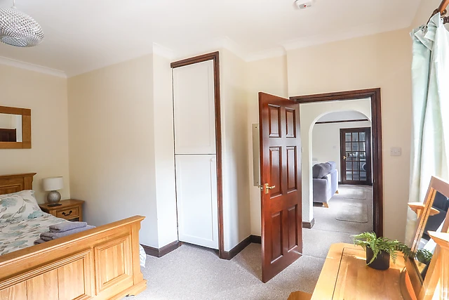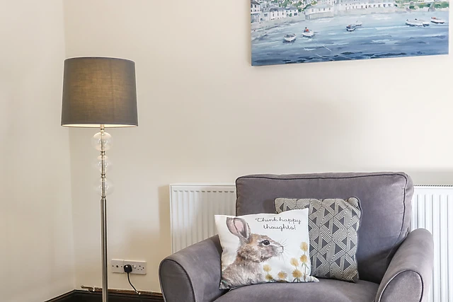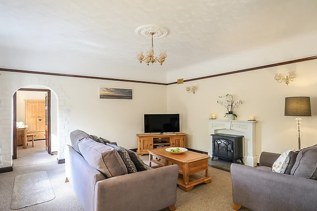 The living space is elegantly furnished, providing a cosy electric fire and a Smart TV for your entertainment.