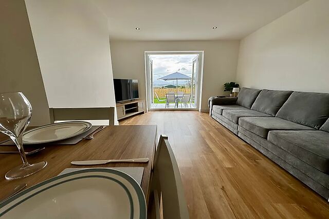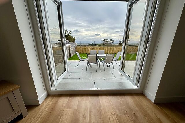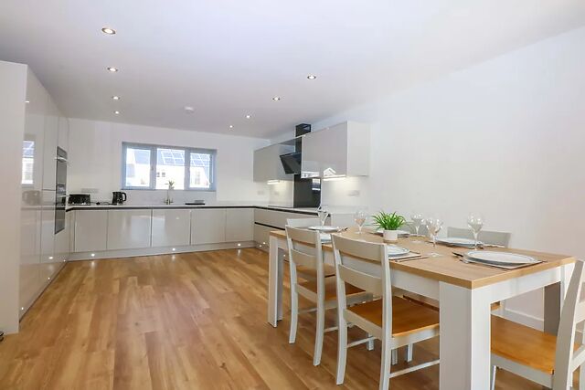 Upon entering the property, your toes will be warmed by underfloor heating as a a spacious open-plan living area invites you inside, complete with a double oven, microwave, fridge/freezer, dishwasher, and washing machine for all your culinary needs. The dining area easily seats six, making it the perfect spot for enjoying home-cooked meals together.