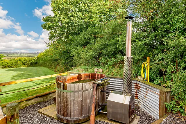 Yes, the accommodation boasts a wood-fired hot tub with an overhead cover, perfect for relaxing while enjoying the surrounding views.