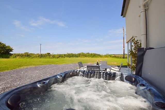 Enjoy the stunning Welsh countryside views from the hot tub in the enclosed garden.