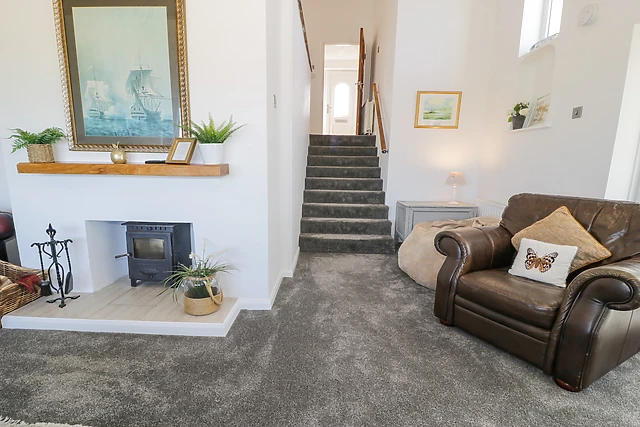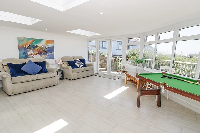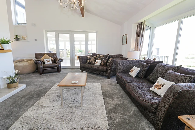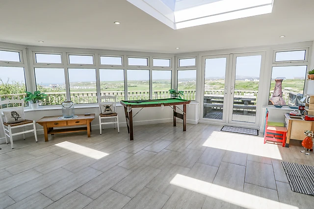 The wow factor begins with the gallery dining area, and lower vaulted ceiling sitting room with its cosy woodburner and picture window. Enjoy the scenery from the sumptuous living area or the sun room with stunning countryside and sea views with X box, games and a pool table.Better yet, the decked balcony is your own little haven to look out towards stunning views over Holyhead golf course, Holyhead mountain, farmland and out towards the sea.