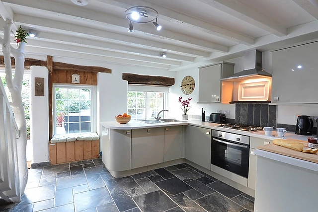 The kitchen is well-appointed with modern appliances, including a gas cooker, microwave, dishwasher, and a fridge with a freezer compartment, catering to all your culinary needs.
