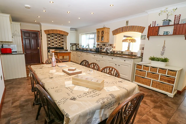 The kitchen is fully equipped with a range cooker, electric oven, hob, microwave, fridge, freezers, wine chiller, washing machine, tumble dryer, and dishwasher, catering to all your culinary needs during your stay.