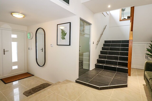 Stepping onto the driveway, you`ll hear the gravel crunch beneath you as you approach the property’s gate, leading to the wrap-around garden. The garden is beautifully landscaped, featuring a neat lawn with fencing and manicured hedges that provide plenty of privacy and enclosed security.