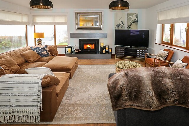 Swyn Llyr is a stylish, coastal house in Rhosneigr, Anglesey, one of Wales’s most sought-after holiday locations. Perfect for large families and friends and boasting a woodburning stove, a hot tub, a cinema room, games rooms and stunning sea views from the balcony.